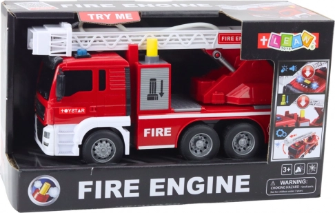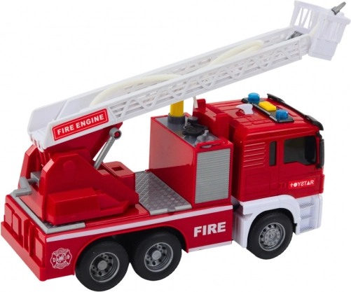 Interaktiv brandbil 1:14 med vandsprøjt, lys og lyd. Friktionsdrev, 360° drejbar udtrækkelig stige, gummidæk, batterier inkluderet.