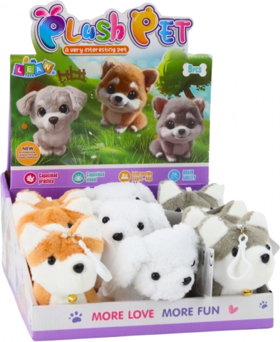 Sød plys-hund med logrende hale som nøglering til nøgler eller rygsæk. Blødt materiale, solid fastgørelse, forskellige farver og racer. Tilfældig udvælgelse.