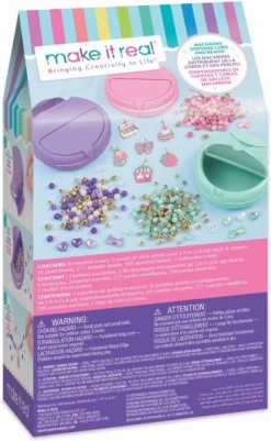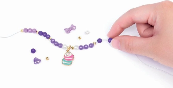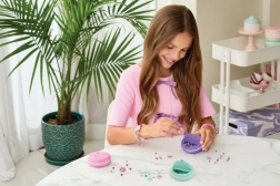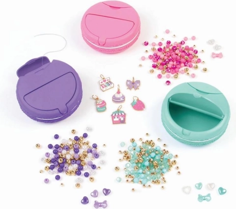 Opdag en sød verden af kreativitet med sættet Macaron-æske til armbåndsfremstilling. Hver farvet macaron rummer perler, vedhæng og snore, som blot skal trækkes på for at skabe originale armbånd med dessertmotiver. Takket være den smarte emballage kan du nemt måle og klippe den nødvendige snorlængde direkte rundt om macaronens omkreds.