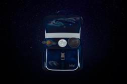 Let og ergonomisk skolesæt til første klasse med rumtema: Zippy skoletaske med justerbart ryggsystem, et-etagers penalhus med organisering og en praktisk pose med lynlåslomme. Skoletasken af vandafvisende materiale tilbyder refleksdetaljer for sikkerhed, kvalitetslynlåse YKK og smart indvendig organisering. Ideel kombination til komfortabel og sikker hverdagsbrug i skolen.