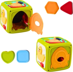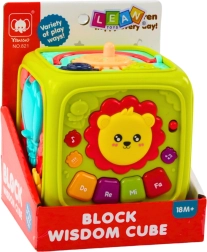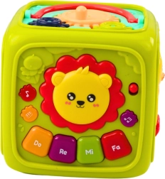 Den interaktive terning indeholder musikelementer såsom tangenter med melodier og en venlig løve, der opmuntrer til interaktion. Du finder også formsortering, bevægelige døre, roterende elementer og glade illustrationer med dyr. Legetøjet afspiller lyde og sange, som stimulerer sanserne og udvikler hørelsen hos de mindste.