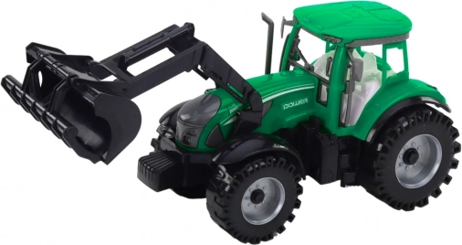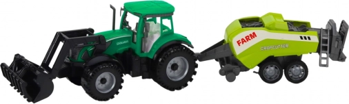 Grøn traktor med frontlæsser og høpresser – plastisk farmsæt til børn