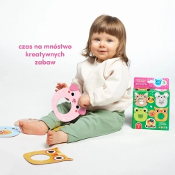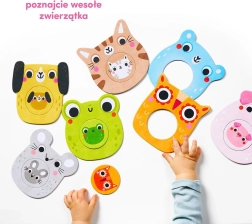 Mine puslespil med hul – Dyrene er et ideelt valg for små begyndere. Takket være de store brikker og smarte hjul, der kan byttes frit rundt, træner børn fingrenes snilde, hånd–øje-koordination og logisk tænkning. Dyrene inviterer til at navngive farver, former og til at opdage forskelle mellem stor og lille.