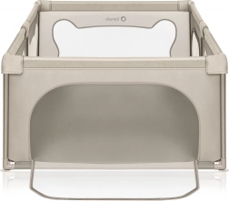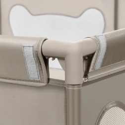 Montering og sammenklapning er ubekompliceret og kræver intet værktøj, hvilket gør den til en ideel løsning også på rejser. Gården er udstyret med beskyttede skumrør og konstruktionsdele på ydersiden for at sikre barnets sikkerhed. I hjørnerne er der sugekopper, som holder den stabilt på plads.