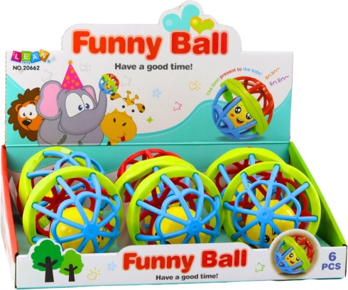Inde i bolden sidder en gul plastkugle, som ved rystning afgiver en blid rangellyd og fremmer interaktion og nysgerrighed. Den ergonomiske form ligger godt i små børnehænder, og den lave vægt gør den nem at håndtere.