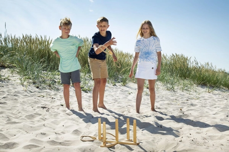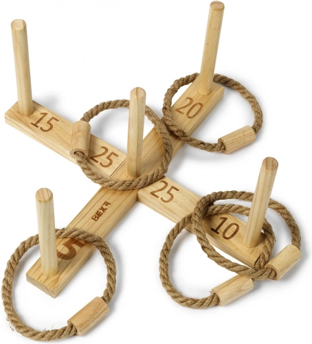 Ringspillet RING TOSS FAMILY er ideelt til udendørs underholdning og træning af præcision. Ringene af robust reb og den stabile træbase med nummererede pinde sikrer retfærdig pointtælling og timevis af konkurrence for både børn og voksne. Takket være de kompakte mål kan du nemt tage det med i haven, på stranden eller på tur.