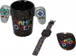 Nyd din yndlingsdrik med et strejf af gaming-nostalgi. Dette sort keramiske krus med GAME OVER-motiv byder på et utraditionelt design med to hanke formet som spilcontrollere og farvede knapper. Det sjove look fuldendes af behageligt greb og praktiske mål til daglig brug.