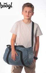Sportstaske Hoop Dust Blue: Let og sammenfoldelig med en bæreevne på 5 kg og et volumen på 22 l. Udstyret med en justerbar strop og en integreret lomme, hvori tasken nemt kan pakkes sammen. Fremstillet af genbrugsmateriale og tilpasningsdygtig til rejser.