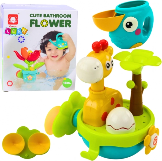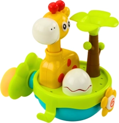 Sættet indeholder en sød giraf med bevægelige dele, en farverig palme, blomster og farverige vandrotorer. Der er også en praktisk kop med sprøjtefunktion, som kan bruges til at hælde vand på legetøjet. Når barnet hælder vand på bestemte steder, bliver legetøjet levende - dele begynder at dreje, blomster bevæger sig og vand løber, hvilket fanger opmærksomheden og bringer megen glæde.