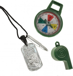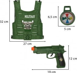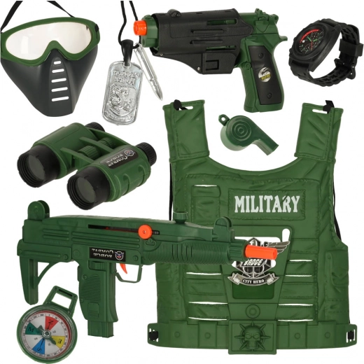 Dette militærsæt er ideelt for alle små eventyrelskere og militærspil. Med dette sæt kan børn opleve spændende missioner og eventyr. Indeholder: vest, kikkert, riffel med mekanisk genladning, batteridrevet pistol, silikoneur, øjenmaske, kompas, rigtig fløjte, militært ID-mærke og pistolhylster. Hvert element er lavet af kvalitetsmaterialer og tilbyder realistiske detaljer.