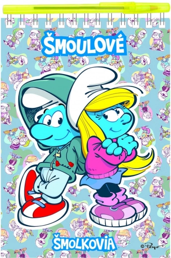 Praktisk notesblok med motiv af Smølferne kombinerer linjerede og blanke sider, har en stiv, blank omslag, øvre twin-wire spiralbinding og leveres med en kuglepen i en transparent pose.