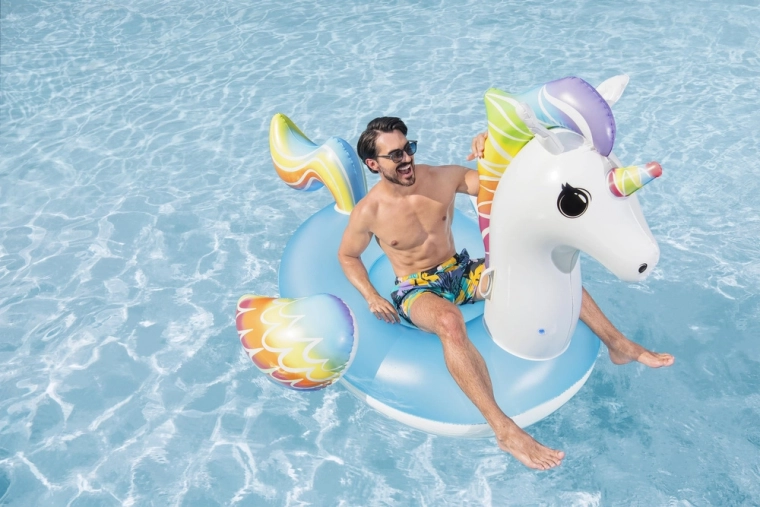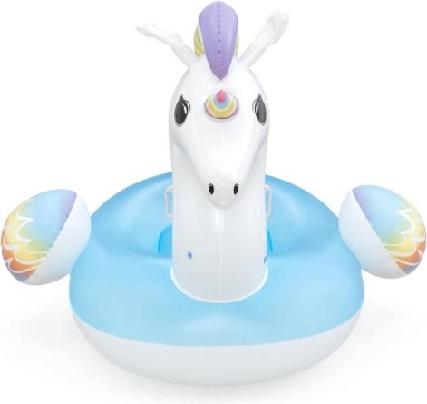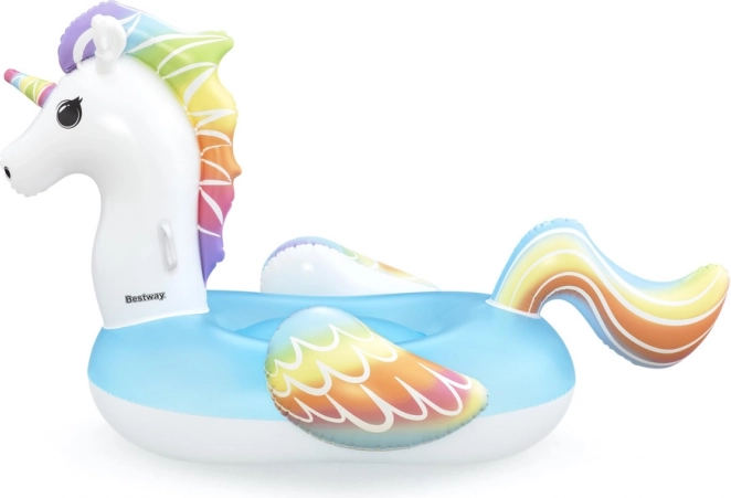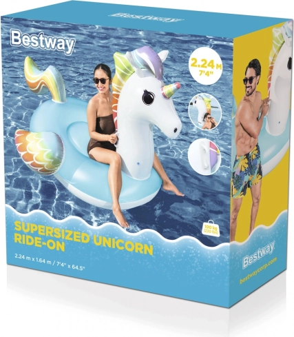 Oppustelig enhjørning Bestway - XXL størrelse 224x164 cm, ideel til afslapning på vandet med solide håndtag og højkvalitets PVC-materiale.