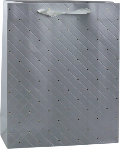 Denne stilfulde grå gavepose er det perfekte valg for dem, der foretrækker moderne elegance og et klassisk look. Dens bløde farve kombineret med geometrisk mønster og gyldne prikker giver et sofistikeret udseende, ideelt til bryllupper og festlige anledninger.