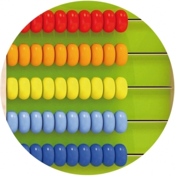 Fem rækker perler i klare farver guider børn til naturligt at udforske tal, addition og subtraktion på en sjov måde.
