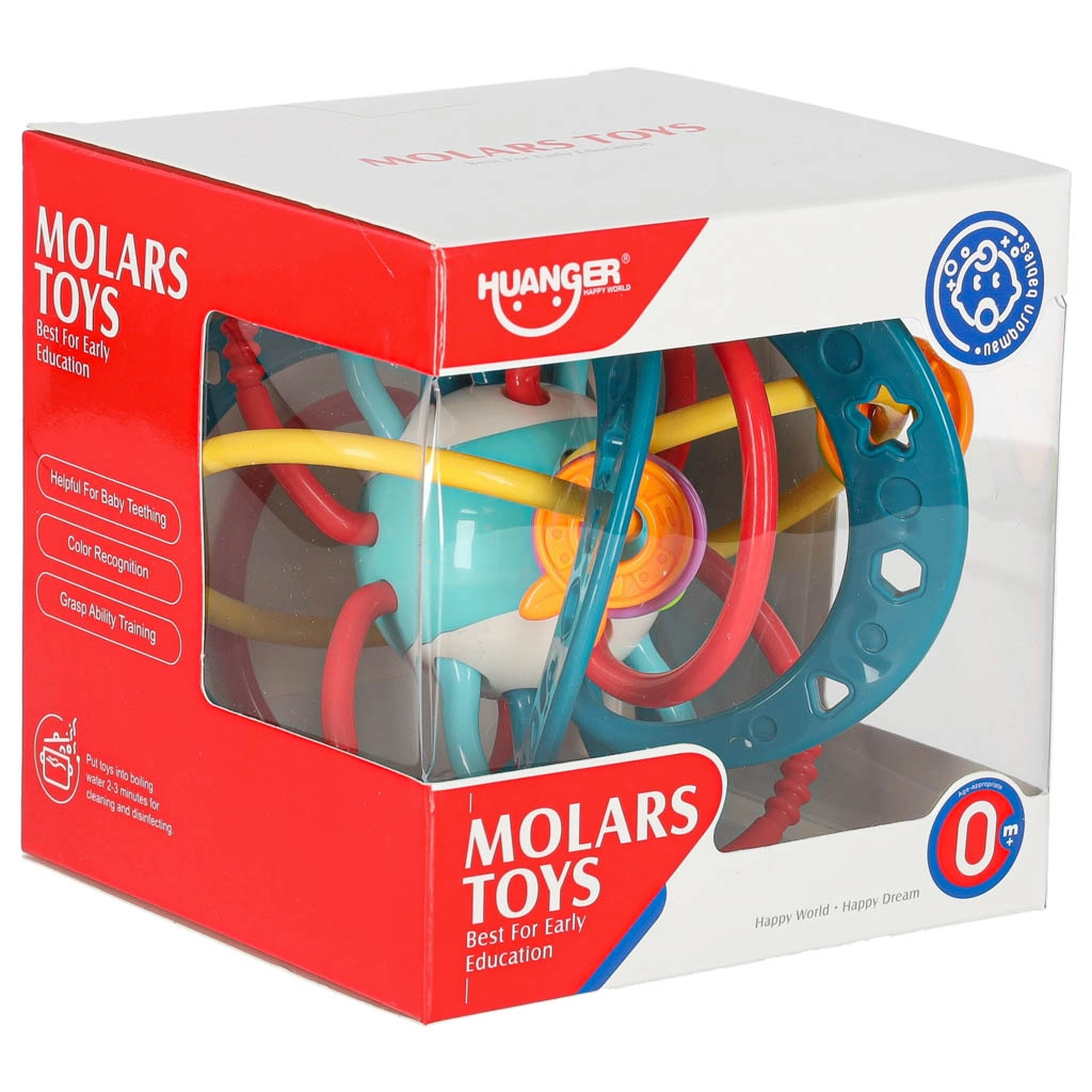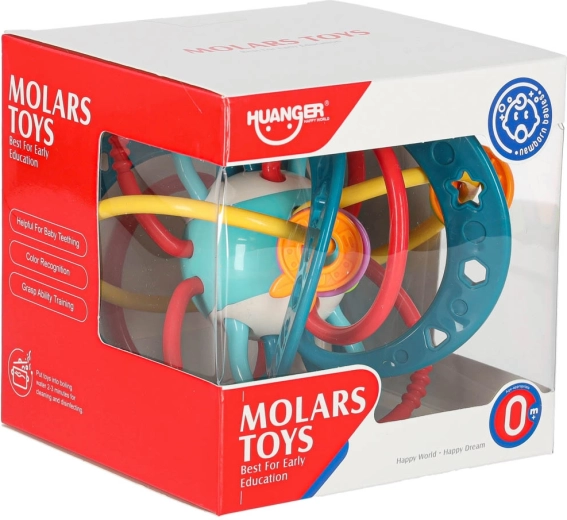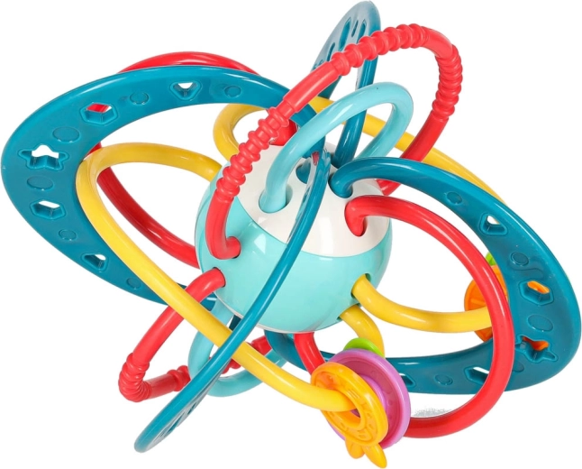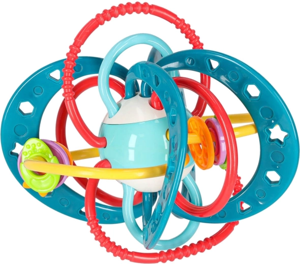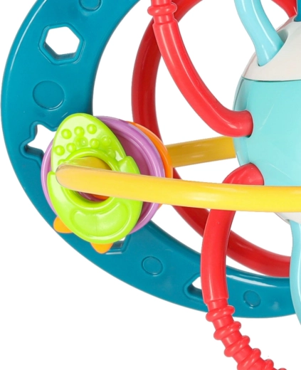 Denne turkise bidering–rangle er designet til de mindste hænder. De sammenflettede løkker og ringe er nemme at holde om, forskellige overflader masserer gummerne, og de farverige elementer fanger opmærksomheden. Når barnet ryster, aktiveres en blid raslen, som understøtter sanseudviklingen.