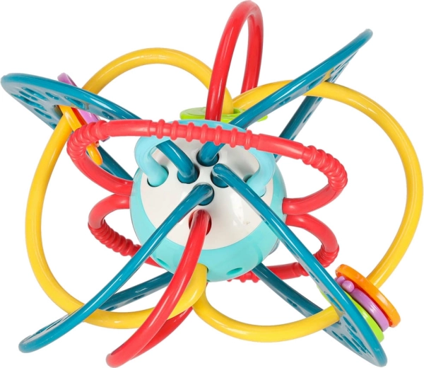 Forskellige overflader masserer blidt gummerne og giver lindring under tandfrembrud, mens de flytbare ringe underholder barnet.