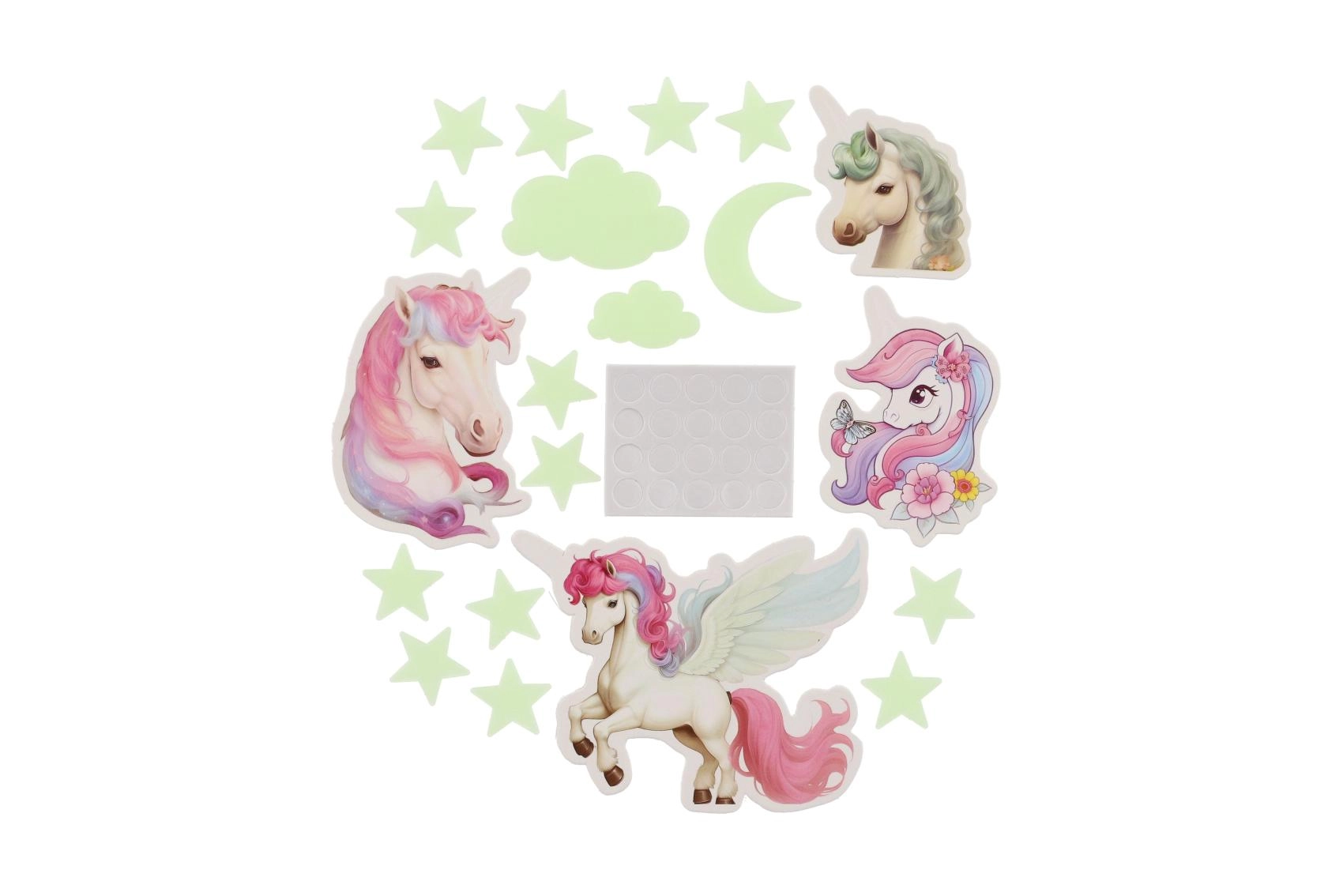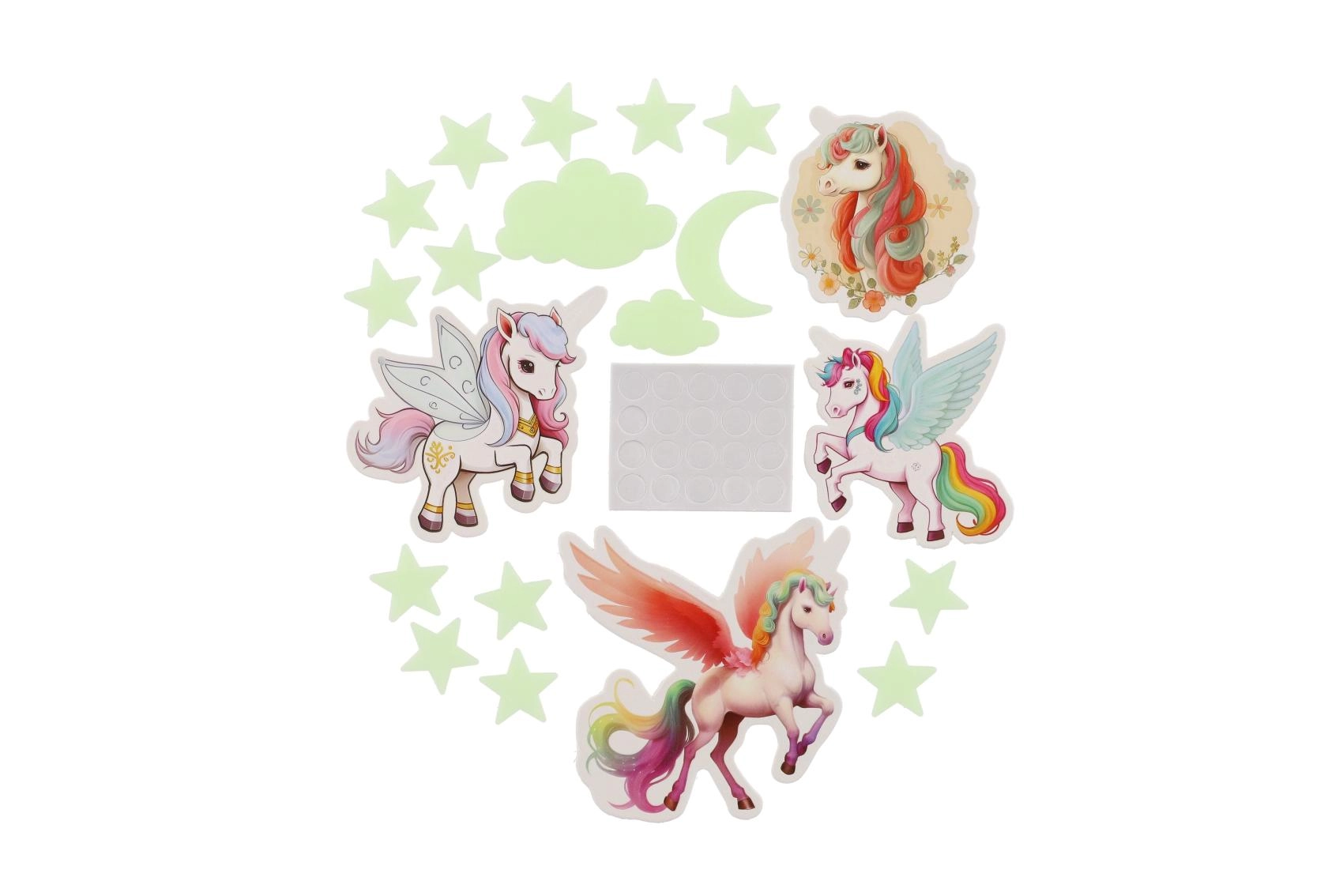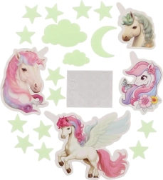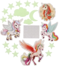 Skab en magisk verden for børnene direkte på deres værelse. De selvlysende enhjørninger lyser op efter opladning og giver et blidt skær, som beroliger og hjælper ved sengetid. Sættet indeholder forskellige former og størrelser af enhjørninger til kreativ dekoration af både vægge og loft.