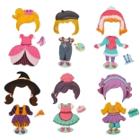 Et rigt sæt af magnetiske outfits, frisurer og tilbehør med forlægskort giver masser af outfits og scener. Perfekt til at øve efter skabelon og til fri kreativ leg.