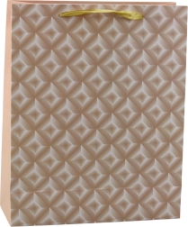 Gaveposen er lavet af højkvalitets forstærket papir, og dens overflade er udsmykket med et præget geometrisk mønster, der smukt reflekterer lyset. To varianter af for- og bagside sikrer, at posen ser stilfuld ud fra enhver vinkel. Satinsnore i en lys nuance giver hele kompositionen et blødt udtryk og sikrer behagelig bæring.