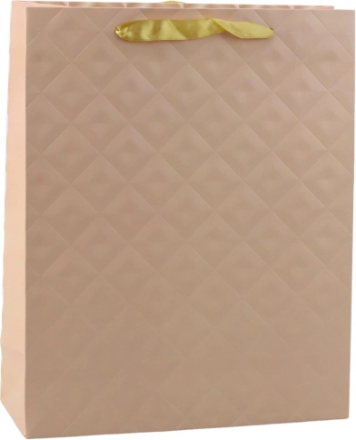 Elegant gavepose med beige præget mønster, egnet til enhver anledning. Fremstillet af kvalitets papir, med satinsnore og et moderne design.