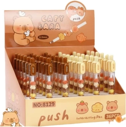 Kuglepen med kapybara-figurer er et unikt tilbehør, der på behagelig vis kombinerer praktisk funktion med et sjovt udseende. Den indeholder en gennemsigtig del med farverige, bevægelige kapybara-figurer.
