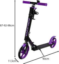 Let byscooter KRUZZEL med store 200 mm hjul for jævn kørsel på fortove og ujævnt underlag. Takket være den sammenklappelige konstruktion, justerbare styr (87–92–98 cm) og fodbremse tilbyder den sikkerhed, komfort og nem transport med den justerbare skulderrem. Skridsikkert deck, tilbehør i pakken og ABEC‑7-lejer sikrer tryghed samt stille og glidende kørsel.