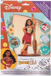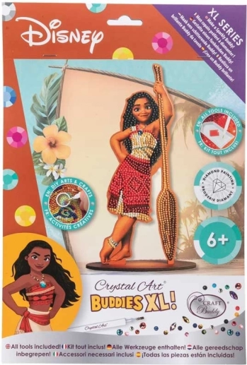 Pakken indeholder alt, hvad du behøver for at skabe billedet: en træplade formet som Moana-figuren, en træstand, en pen til påføring af sten, en bakke, voks og et sæt farvede sten. Produktet måler cirka 25 cm og er derfor ideelt som hjemmedekoration eller som gave til elskere af kreativ underholdning.