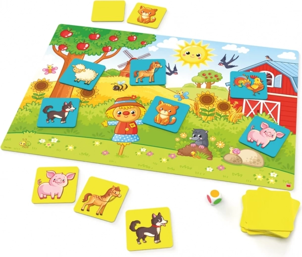 - farverig spilleplade, solide dyrekort, terning (jf. beskrivelse)