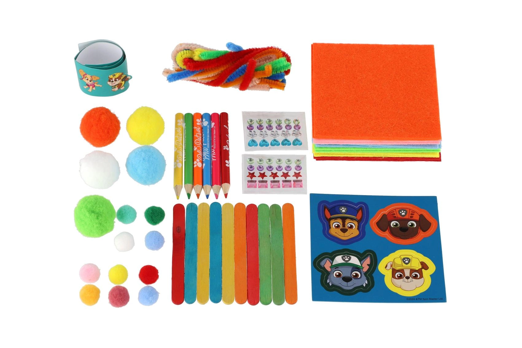 - Rigt indhold – pomponer, pelsede piberensere, skumfigurer, træpinde, farveblyanter og PAW PATROL-klistermærker.