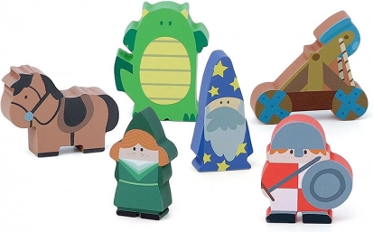 - 6 figurer: ridder, drage, prinsesse, katapult, hest og troldmand
