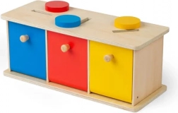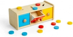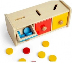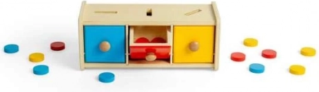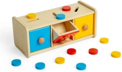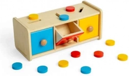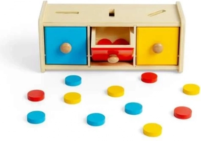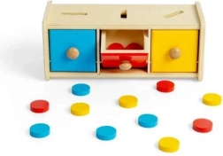 Denne smukke sorteringsboks indeholder 15 skiver i tre forskellige farver: gul, rød og blå, som børnene lægger i de rigtige åbninger. Legetøjet omfatter også en trækasse med tre skuffer. Sorteringsboksen er en del af Montessori-læringsprogrammet, der motiverer børn til at lære gennem leg.
