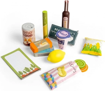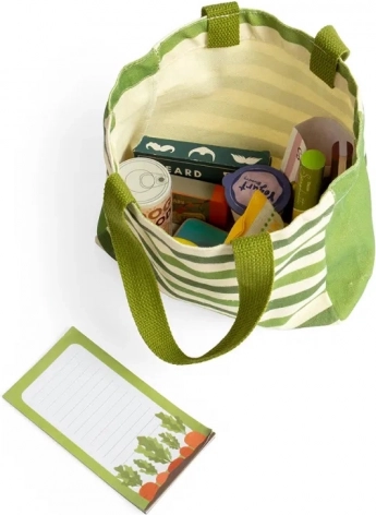 Indkøbspose med tilbehør fra Bigjigs Toys er ideel til leg-butik derhjemme. Den indeholder 17 forskellige varer, som helt sikkert vil glæde små butiksejere.