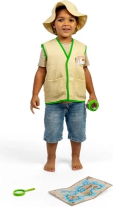 Opdagelsesrejsende-kostumet er ideelt til at udvikle fantasi og kreativitet. Det indeholder en vest, hat, navneskilt, detaljeret kort, lup, træfossiler, kompas og en speciel insektlup, som sikrer både sjov og læring.