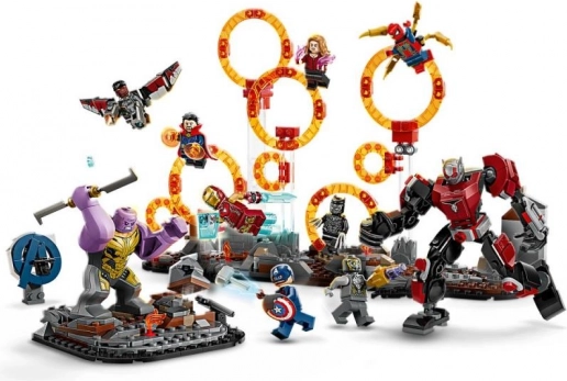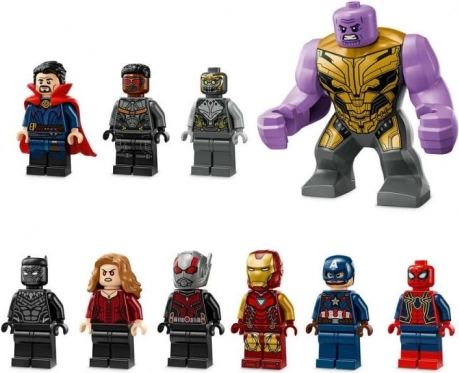 Ni detaljerede minifigurer inklusive Captain America, IRON MAN, SCARLET WITCH, DOCTOR STRANGE, IRON SPIDER, BLACK PANTHER, FALCON og CHITAURI – plus en stor figur af THANOS og en bevægelig ANT-MAN-mech – giver uendelige muligheder for fortællinger.