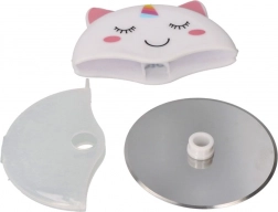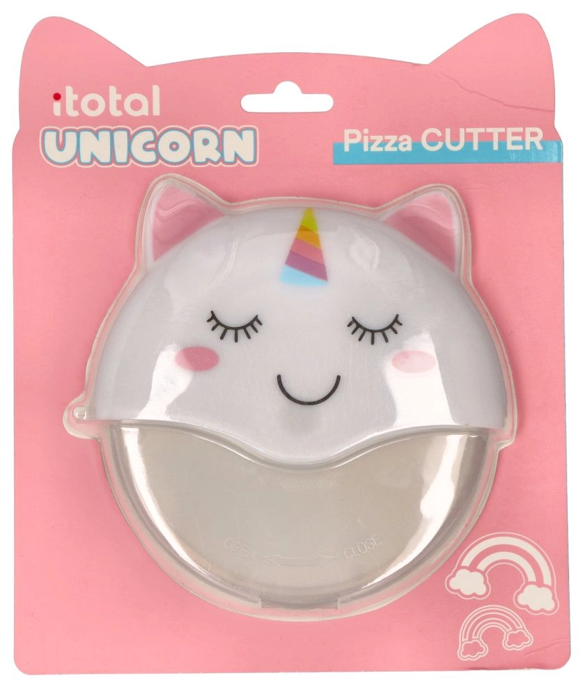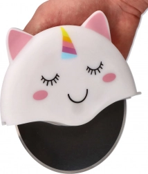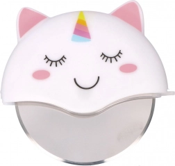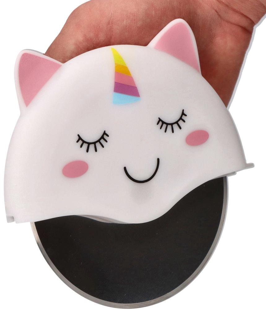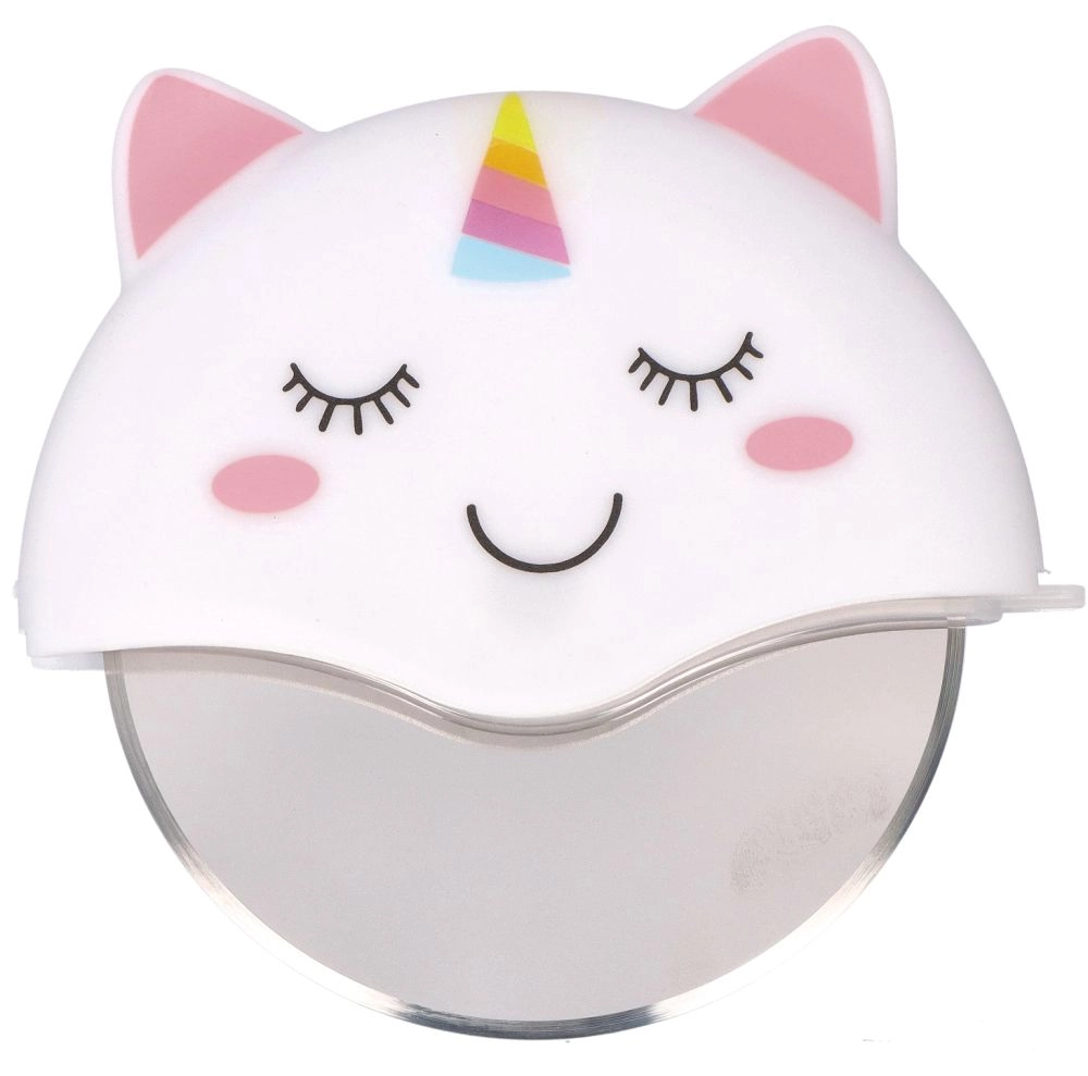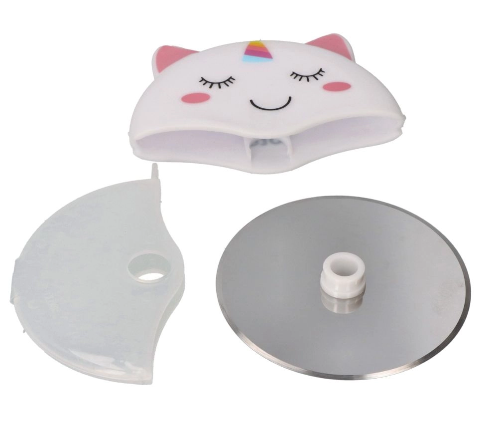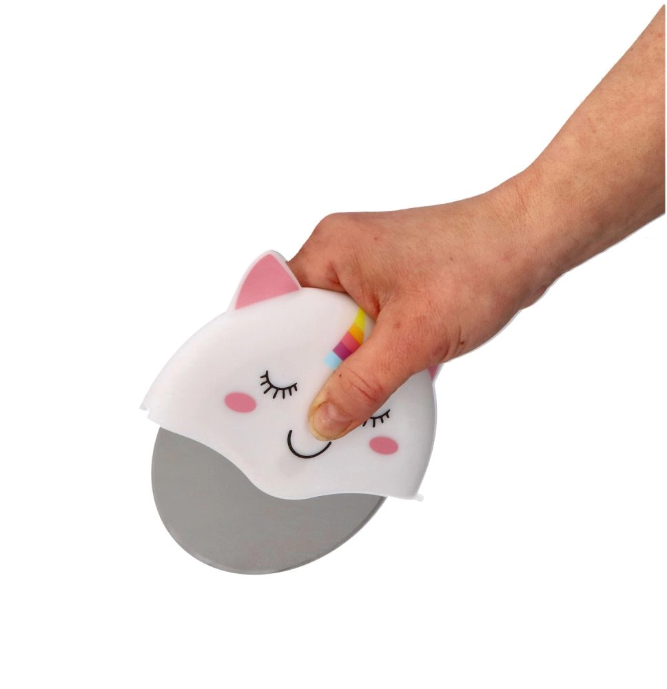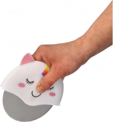 Denne originale pizzaskærer vil begejstre alle, der elsker sjove køkkendetaljer. Det rustfrie stålhjul med stor diameter glider let gennem sprød skorpe og ost, mens det solide håndtag af holdbar plast sikrer et sikkert greb. Den charmerende enhjørning med regnbuehorn giver din servering et magisk strejf.