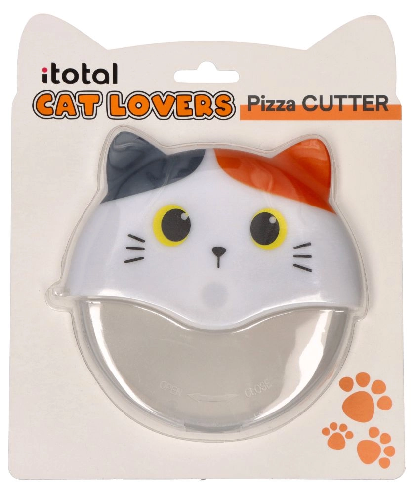 Denne designpizzaskærer med kattemotiv vil glæde enhver pizzalover og fan af søde køkkenting. Den roterende skive i rustfrit stål med en klinge-tykkelse på 0,8 mm sikrer et rent snit uden at rive, mens det ergonomiske plastikhåndtag ligger sikkert i hånden.