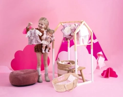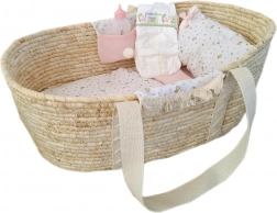 Denne smukke moseskurv har stoflommer på begge sider og inkluderer en dekorativ dyne, pude og madras. Den er velegnet til dukker på 40-45 cm, men fungerer også glimrende som opbevaringsplads til andre legetøj, såsom bamser.