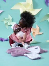 Babydukken har en blød stofkrop med ledede arme og ben, hvilket gør den let at posere og sætte. Sutten i pakken fungerer som et charmerende tilbehør. Dukken er håndlavet i Spanien og leveres i en eksklusiv gaveæske.