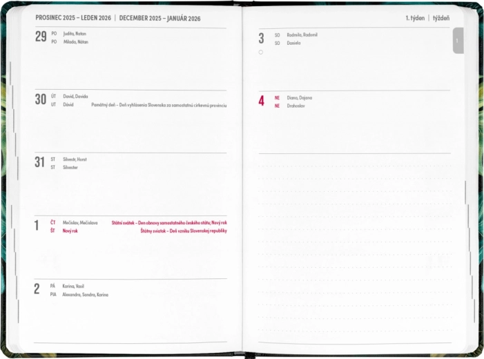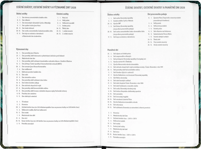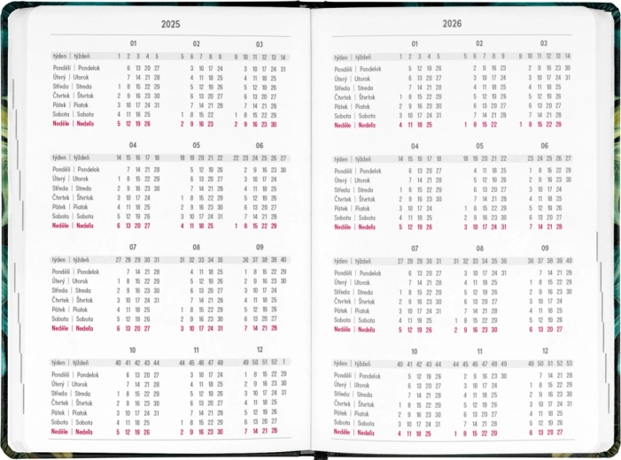 Kalenderen Petito Monstera er den ideelle hjælper til planlægning i perioden fra juli 2025 til december 2026. Med overblik for år 2025 og 2026 og kalendarium med navne og helligdage ikke kun på tjekkisk, men også på slovensk, vil du altid have alt vigtigt ved hånden. Praktisk organisering muliggør nem navigation, og plads til noter giver mulighed for at notere vigtige opgaver og tanker. Kalenderen har et elegant design med Monstera-motiv, der vil glæde enhver elsker af stilfuldt kontorudstyr.