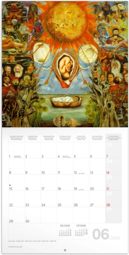 Kalenderen indeholder unikke værker af den ikoniske maler Frida Kahlo. Udnyt det overskuelige kalendarium fra september 2025 til december 2026 på seks sprog for bedre planlægning.