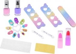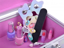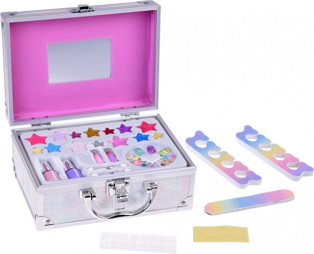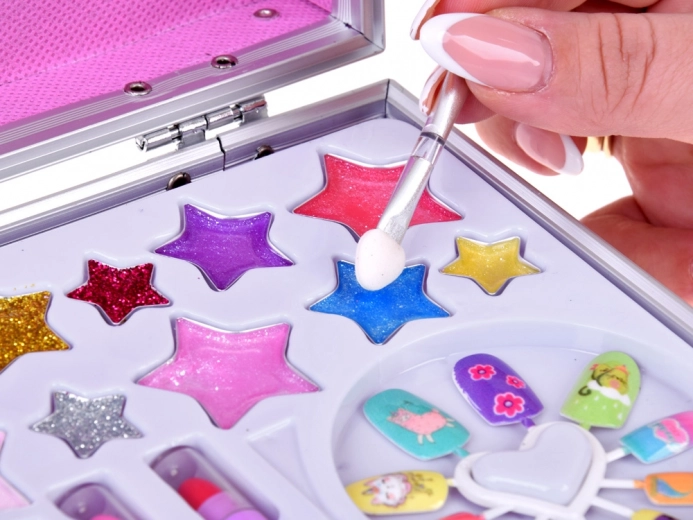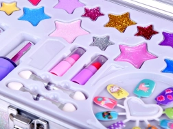 Kufferten indeholder alt, hvad der er brug for til sjov makeup: neglelak, læbestifter, øjenskygger, applikatorer, selvklæbende negle og klistermærker. For nemmere makeup er der også et spejl indeni.