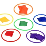 Dette legesæt er ideelt til børn, der elsker at være aktive. Det indeholder seks farvede kegler, tolv tekstilposer og tolv plastringe, der giver mulighed for forskellige former for lege. Børn kan forbedre deres koordination og præcision ved at kaste og sigte.