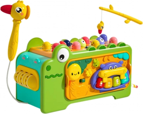 Legetøjet er udstyret med en xylofon med køller, som udvikler høresans og rytme. På undersiden findes en labyrint til at flytte farvede elementer, hvilket træner hånd-øje-koordination. Andre attraktioner er en magnetisk fiskestang og fisk til at fange, roterende tandhjul samt en sød fugl med magnet. Det hele er samlet i en sikker, farverig og holdbar form som en krokodille.