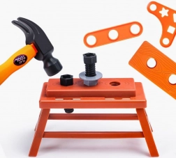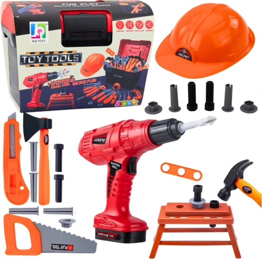 Børneværktøjssættet gør det muligt for børn at lege sikkert med værktøj, der ligner de ægte. Den batteridrevne boremaskine har udskiftelige bits – flad, krydskærv og borebit. Derudover indeholder sættet også en arbejdsbænk og en beskyttelseshjelm for endnu større realisme i legen.