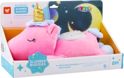 I enhjørningens mave findes et interaktivt panel, som gør det muligt at aktivere forskellige beroligende funktioner. Den er ideel både til nyfødte og større børn, der har brug for hjælp til at falde i søvn.