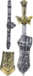 Sættet indeholder alle de vigtige elementer, en lille ridder bør have – et sværd, bælte og to dekorative armbeskyttere, der efterligner rustning. Alle dele er lavet af et holdbart, men let og sikkert materiale, ideelt til daglig leg.