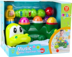Barnet bruger hammeren til at slå på farvede bolde, som falder ind i legetøjet og skydes ud af den bevægelige krokodillemund, hvilket skaber en sjov rutsjebane. Den interaktive hammer lyser, spiller melodier og afgiver yderligere lyde ved at trykke på en speciel knap med en klovn.