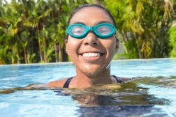 Slagfaste polykarbonatlinser med UV-filter beskytter øjnene mod skadelige solstråler ved udendørs pools og ved havet.