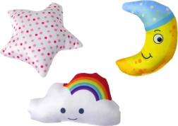 Sættet inkluderer tre bløde og nuttede vedhæng: en måne og to skyer dekoreret med stjerner. Deres behagelige tekstil og pastelfarver fanger barnets opmærksomhed og understøtter udviklingen af syn, berøring og koordination. Vedhængene danser blidt under mobilens rotation og skaber en beroligende oplevelse.