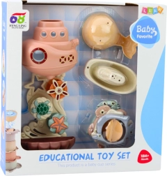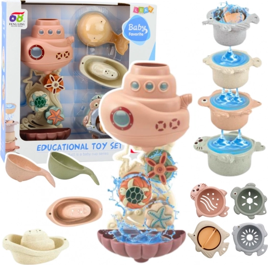 Midtpunktet i sættet er en vandstation med sugekopper, som nemt fastgøres på karrets vægge eller på fliser. Den giver stabilitet og bekvemmelighed under brug og organiserer legeområdet på en attraktiv og sikker måde.